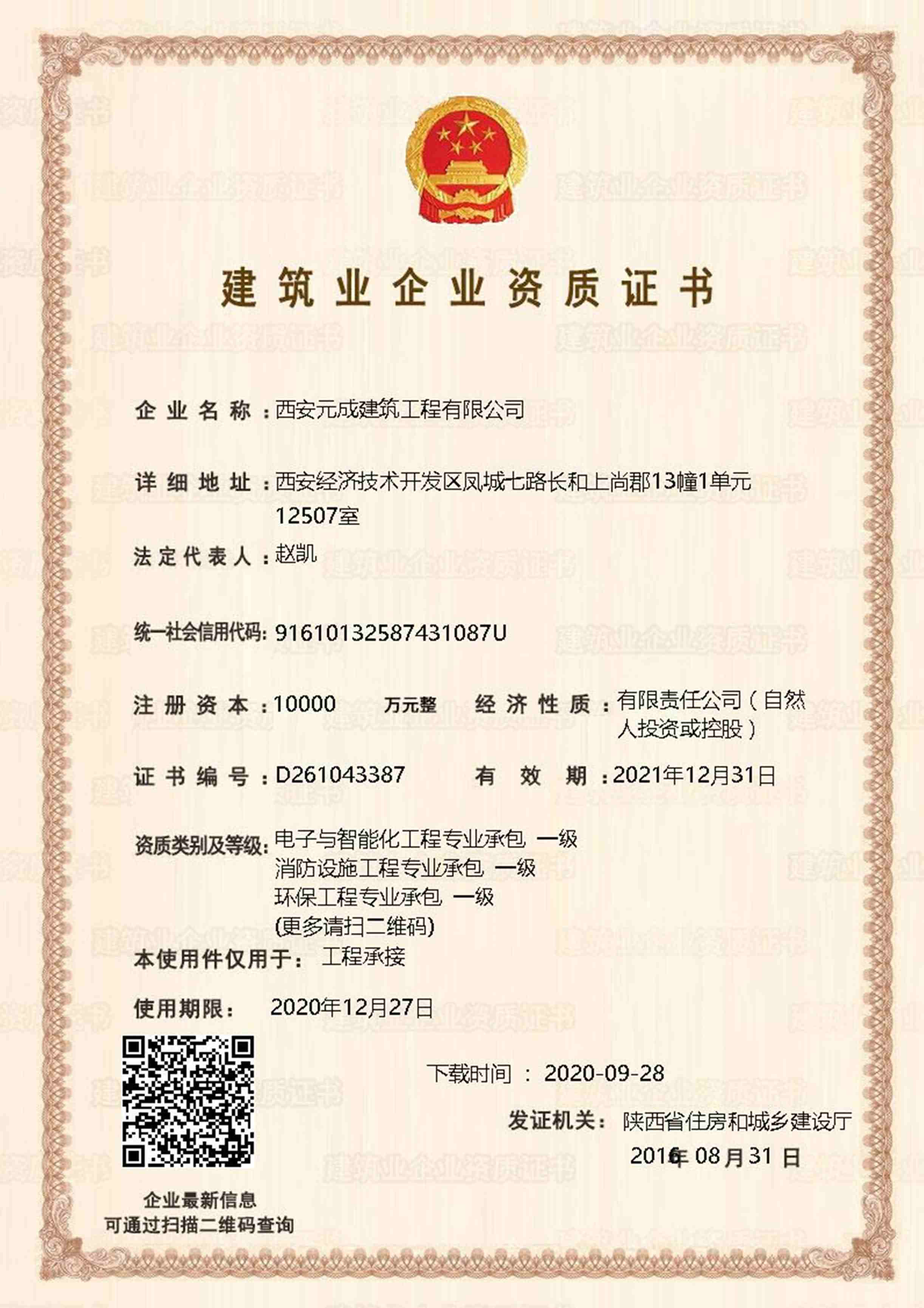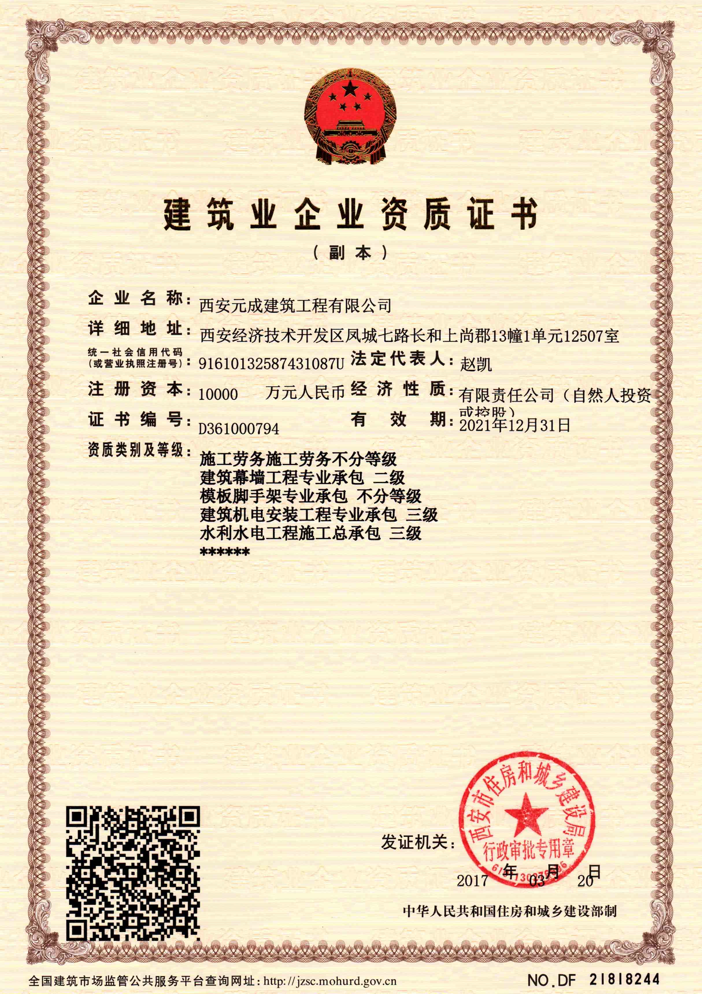 西安元成建筑工程有限公司成立于2012年,是一家擁有建筑工程、市政公用工程、石油化工工程、機(jī)電工程施工總承包貳級(jí);鋼結(jié)構(gòu)工程、防水防腐保溫工程專業(yè)承包貳級(jí);電力工程、水利水電工程施工總承包叁級(jí);建筑機(jī)電安裝工程、輸變電工程、環(huán)保工程專業(yè)承包三級(jí);模板腳手架專業(yè)承包、勞務(wù)分包等綜合性施工企業(yè)。